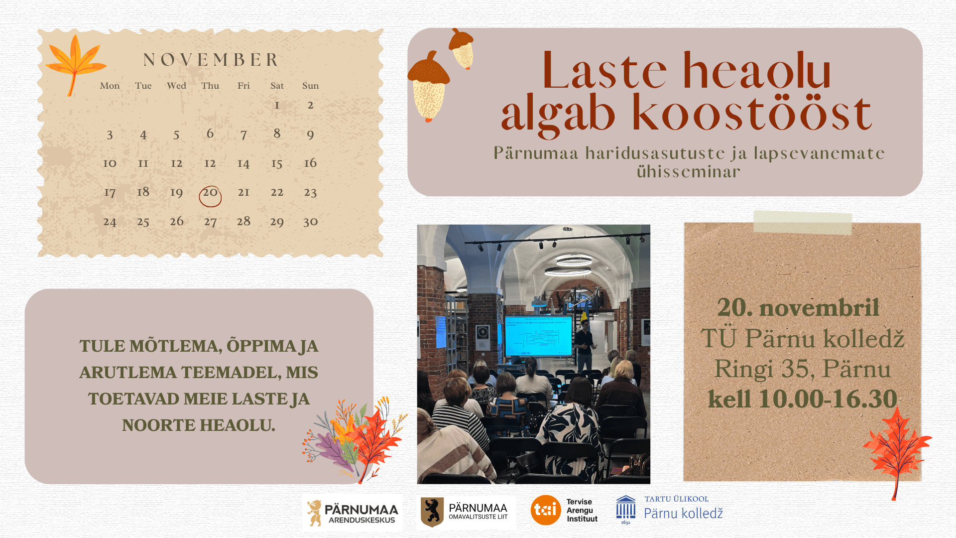Pärnumaa Arenduskeskus, Pärnumaa Omavalitsuste Liit ja TÜ Pärnu kolledž kutsuvad Sind osalema Pärnumaa haridusasutuste ja lapsevanemate ühisseminaril, mis toimub 20. novembril 2025 TÜ Pärnu kolledži raamatukogus (Ringi 35, Pärnu) ning veebi vahendusel.
