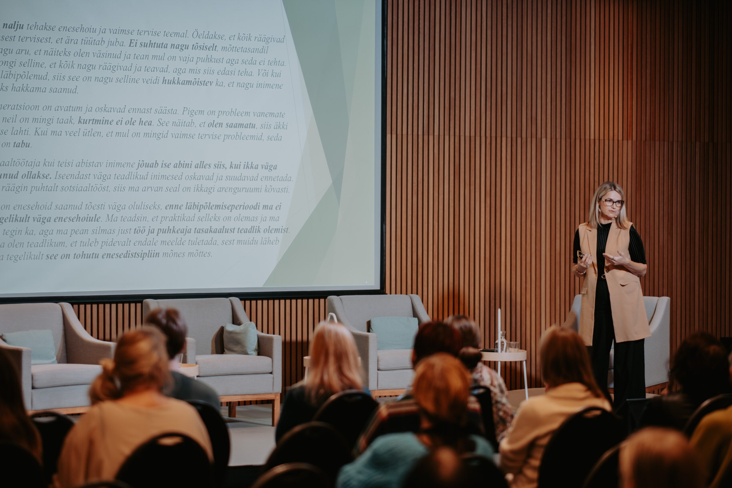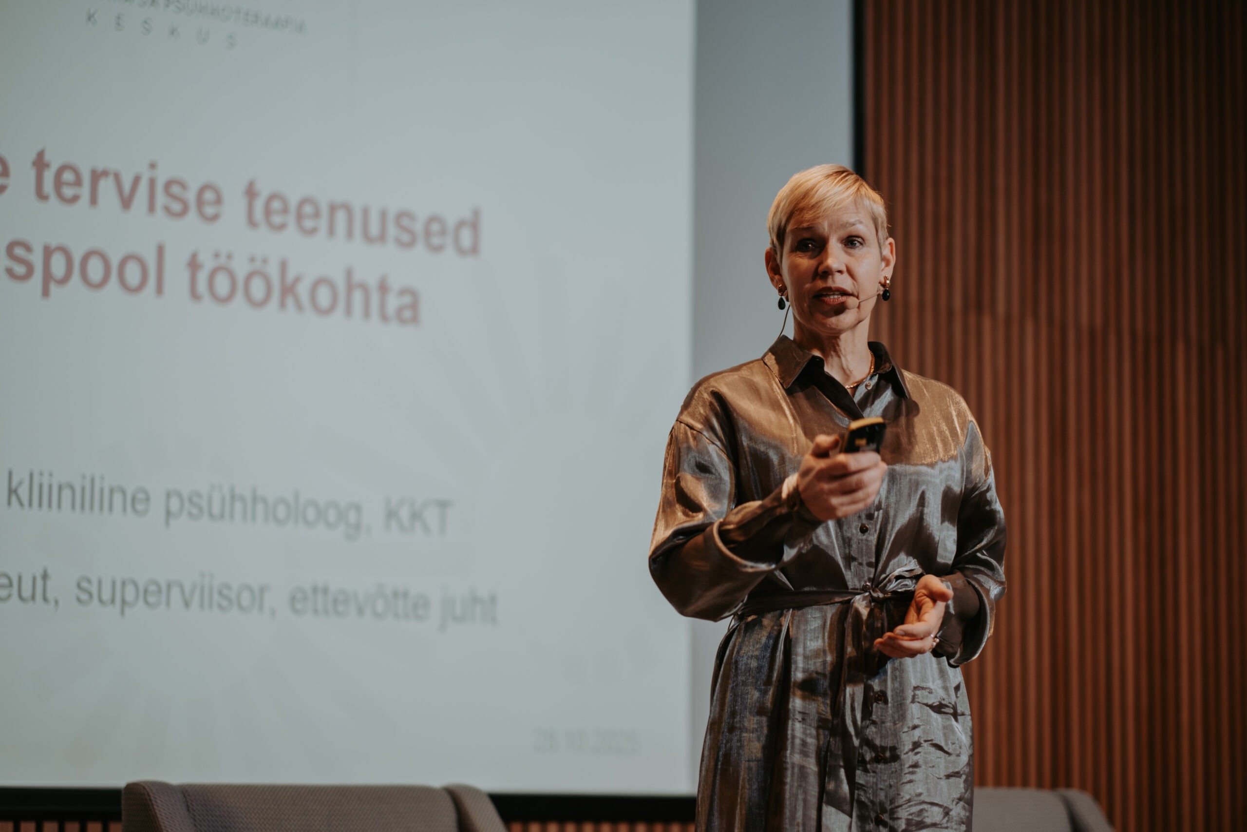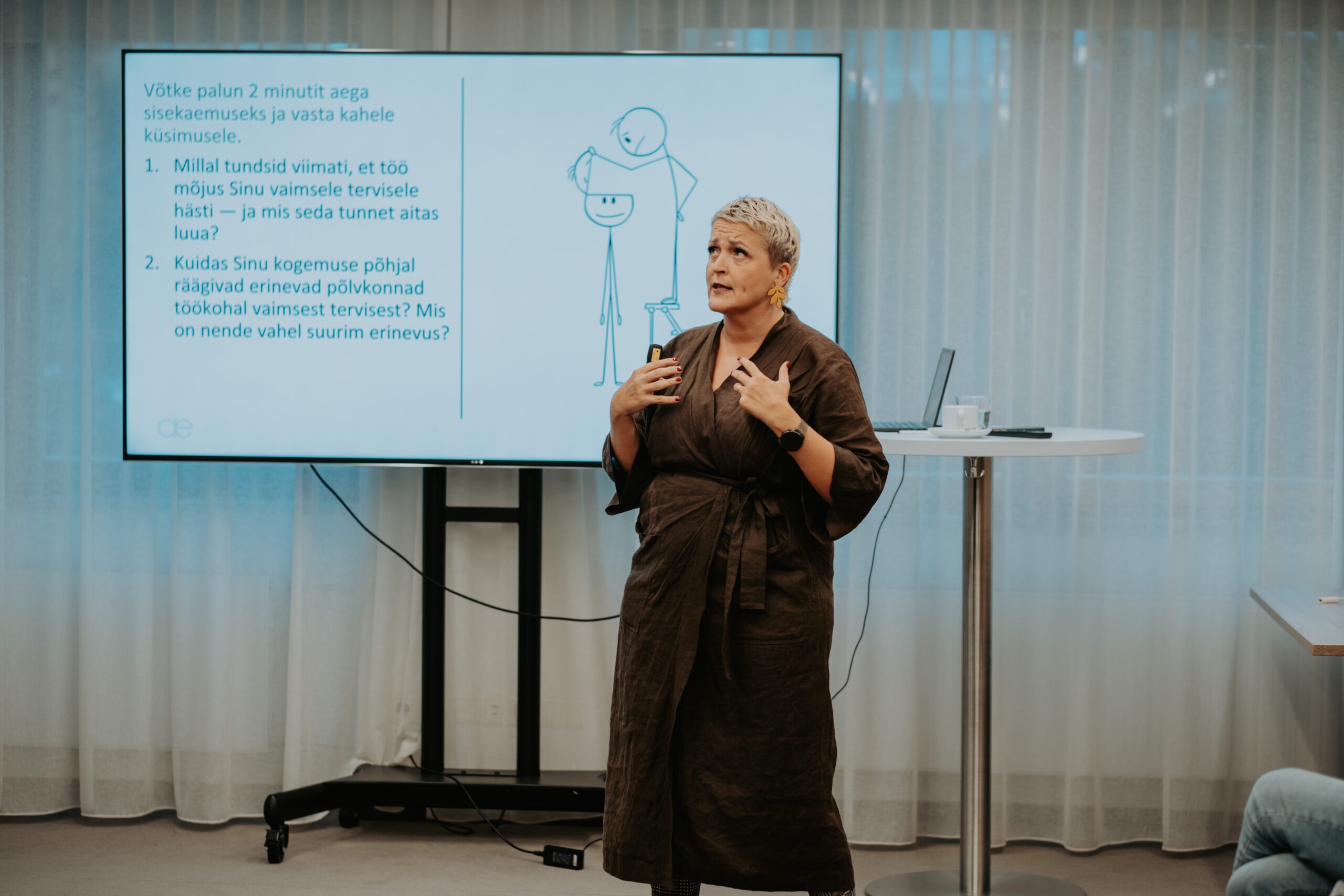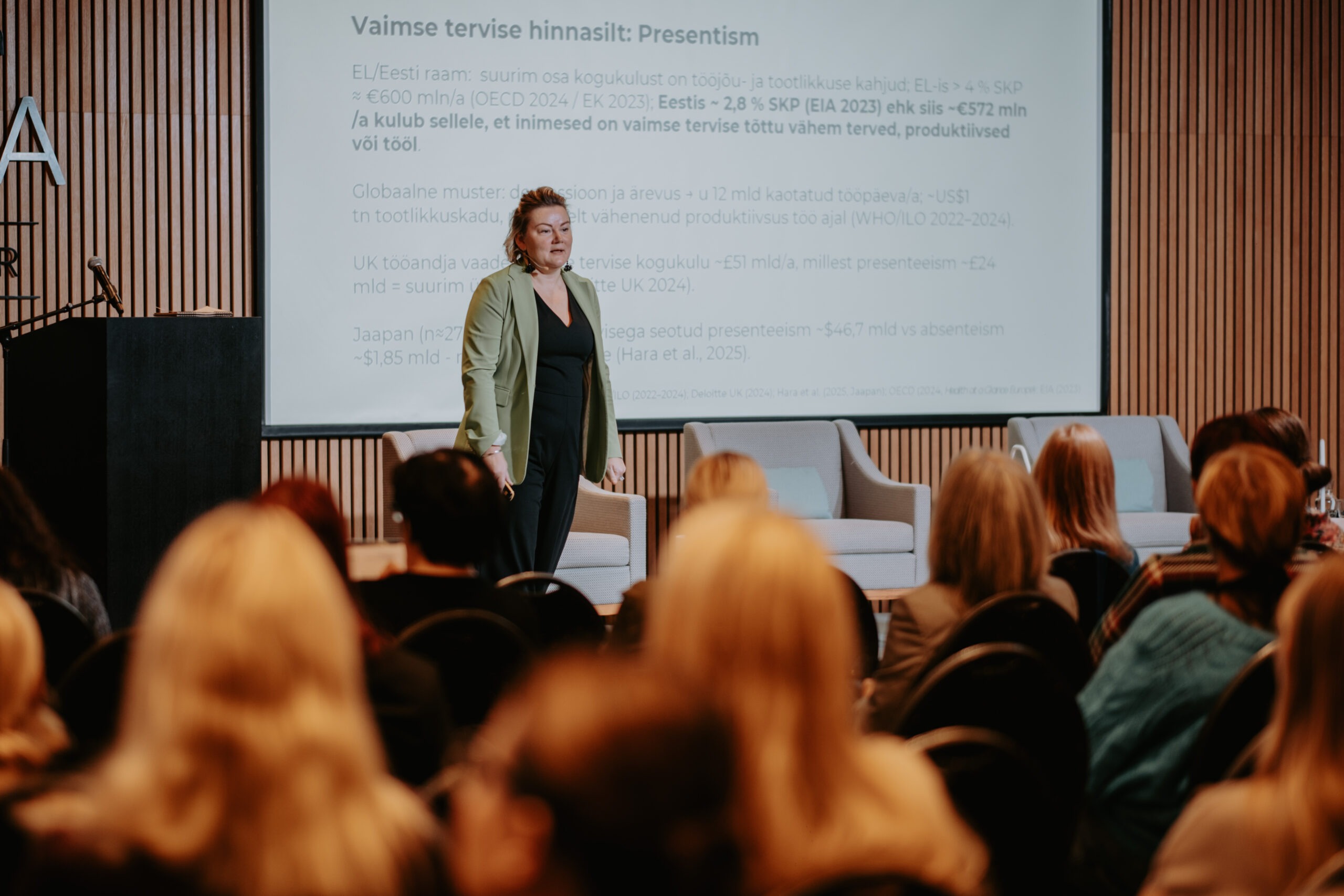 Pärnu kogemusest ja piirkondlikest suundadest kõneldi sessioonis „Salus Mentis Pernaviensis“, kus Diana Paulberg (Viv Living) tutvustas Pärnu elanike enesehoiupraktikaid, Elen Kihl (Sensus OÜ) rääkis vaimse tervise teenustest väljaspool töökohta ning Raine Pilli (Pärnu Haigla) jagas teadmisi Pärnumaa töötajate tööheaolu hetkeseisust.