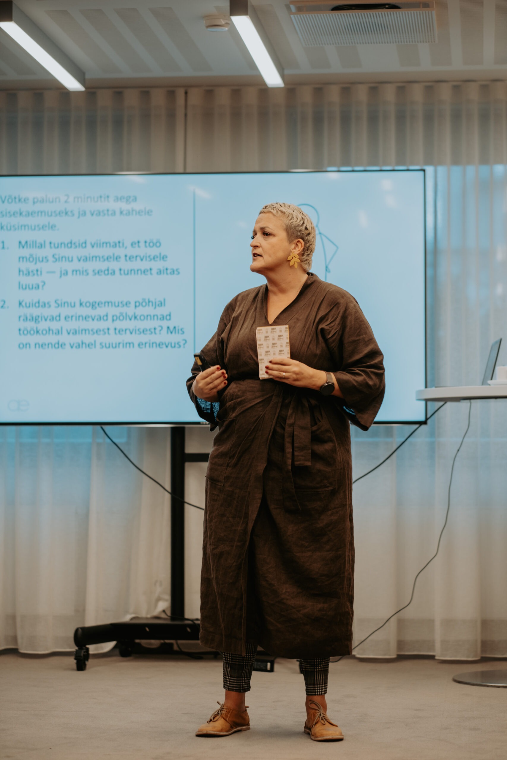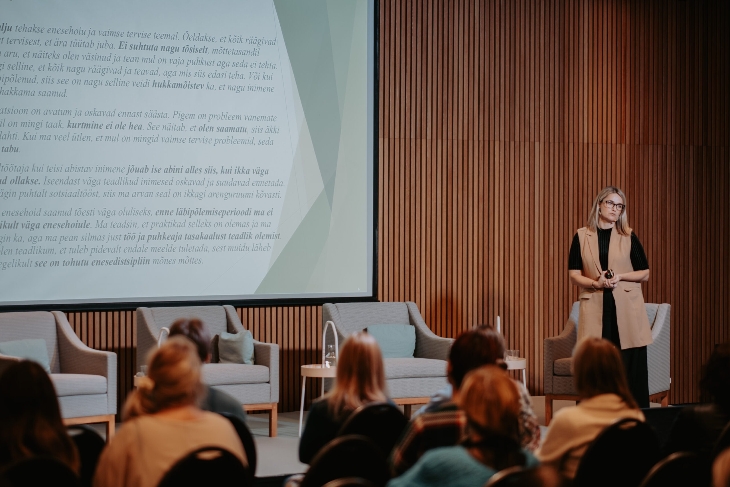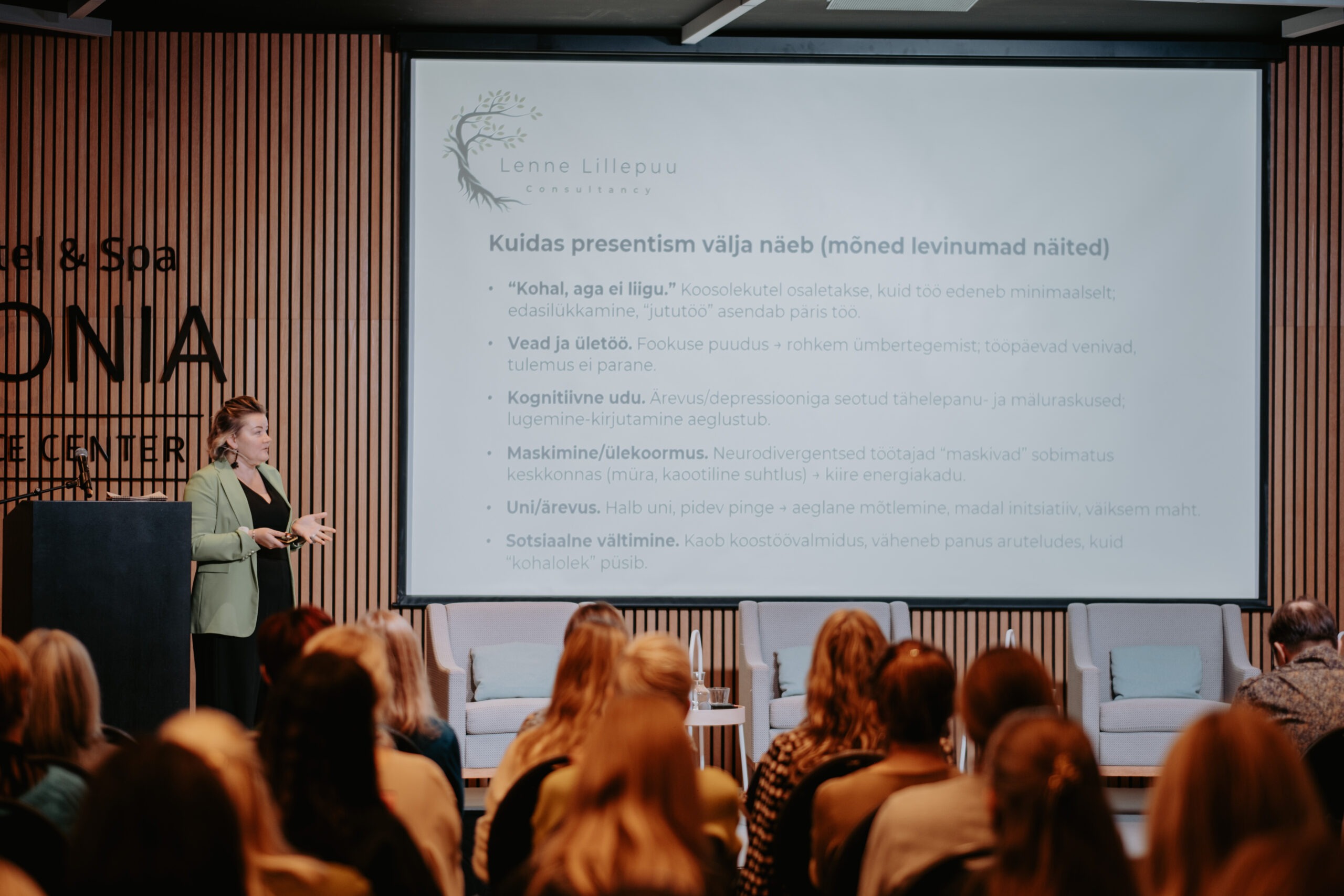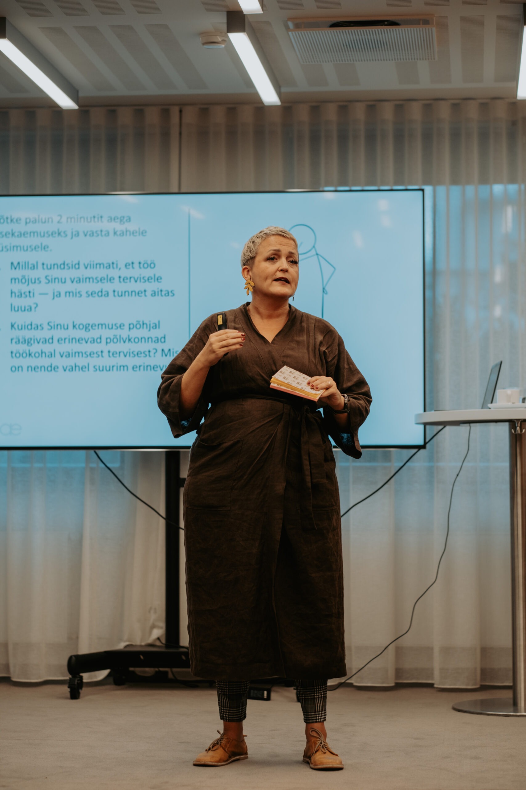 Pärnu kogemusest ja piirkondlikest suundadest kõneldi sessioonis „Salus Mentis Pernaviensis“, kus Diana Paulberg (Viv Living) tutvustas Pärnu elanike enesehoiupraktikaid, Elen Kihl (Sensus OÜ) rääkis vaimse tervise teenustest väljaspool töökohta ning Raine Pilli (Pärnu Haigla) jagas teadmisi Pärnumaa töötajate tööheaolu hetkeseisust.